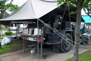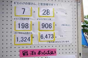 ライフラインは、電気が真っ先に復旧した。多くの施設では、冷暖房や給湯をガスに頼っているが、そのガスは、まだだ(7月30日現在)。水道は復旧しているが、受水槽の検査が済むまでは、飲用や炊事に供せないのだという。ある施設では、衛生的な水の供給を自衛隊にお願いしている。自衛隊の復興支援部隊が施設の駐車場を使って基地を設置している、そのメリットを生かした格好だ。また、自衛隊は、地域住民に対し、お風呂の提供もしてくれている。施設でも、自衛隊に湯を沸かしてもらって、施設内の浴槽に入れてもらっている。湯を汚さずに使う必要があるので、かけ湯のみだが、お風呂の真似事ができるようになっただけでも、ありがたいという。特殊浴槽が必要な要介護者のために、訪問入浴車も借りてきた。