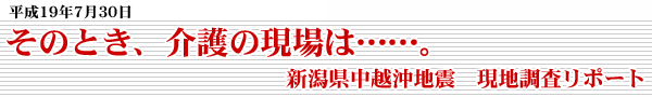 7月30日。新潟県中越沖地震が起きた7月15日から既に半月が過ぎてしまってはいたが、私たち公明党神奈川県議団の有志4名は、参院選の戦いを終えるや否や、被災地に向かったのである。今回の現地調査の目的は、大規模な災害が発生したときに、高齢者や障害者など要援護対象の人々が、どのような避難生活を強いられるのかを調べ、さらには、援護の主体となる民間機関が、その活動のなかで直面する行政システム上のさまざまな不都合を知ることにあった。