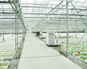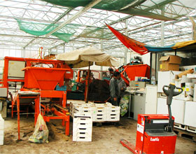 広大な温室だ。自己所有の土地に建てたものが、約3,000m²、借地に建てたものが約7,000m²。農場というより、工場である。このほかに2haの畑で露地栽培を行なっている。常時8人が働いているが、2月から8月は20人に増える。