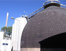 この過程が「消化」で、その間に発生するバイオガスを「消化ガス」と呼んでいる。このガスは、メタンを多く含み可燃性であるため、ボイラー燃料として用いるのが一般的だ。その熱で、嫌気性バクテリアを活性化するために発酵(消化)タンクを暖めたりするのだが、それで消費されるガスは、普通、発生量の半分にも満たないのだという。