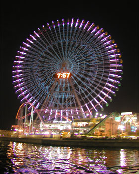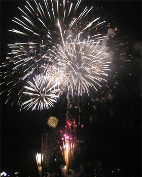 けっこう波が高くて、船酔いをこらえながら待つこと小一時間。やっと花火が上がったと思ったら、10分足らずで終わってしまいました。これで1,500発と翌日の朝刊には出ていました。ほんまかいな。でも、お酒と夜景は楽しめました。ゆれる船の上で、グラスを片手に手持ちで撮ったブレブレ写真です。
